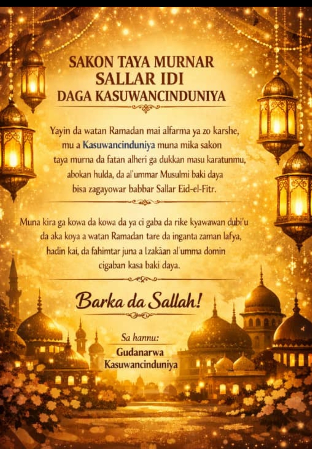 Yayin da watan Ramadan mai alfarma ya zo karshe, mu a Kasuwancinduniya muna mika sakon taya murna da fatan alheri ga dukkan masu karatunmu, abokan hulda, da al’ummar Musulmi baki daya bisa zagayowar babbar Sallar Eid-el-Fitr.